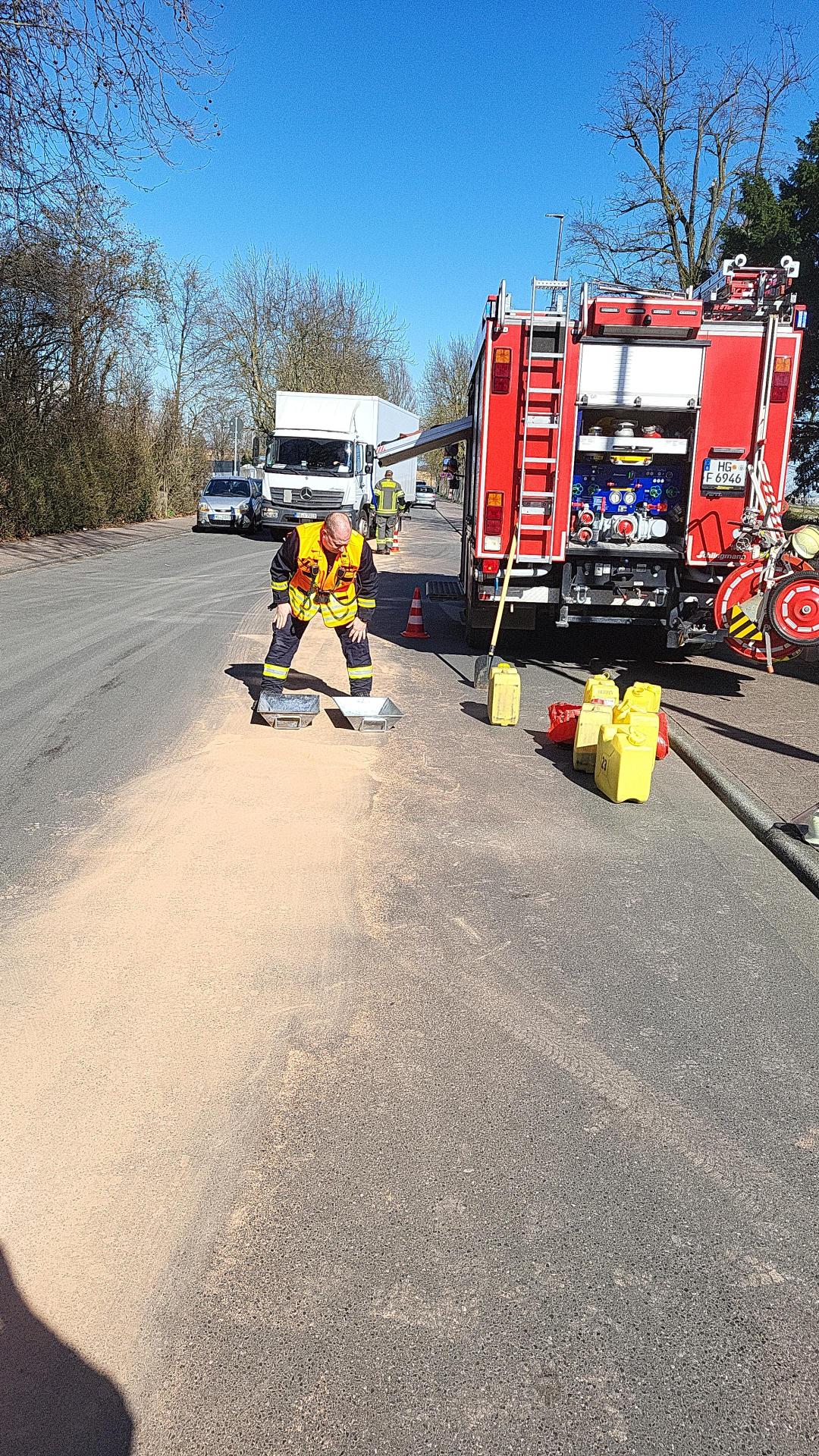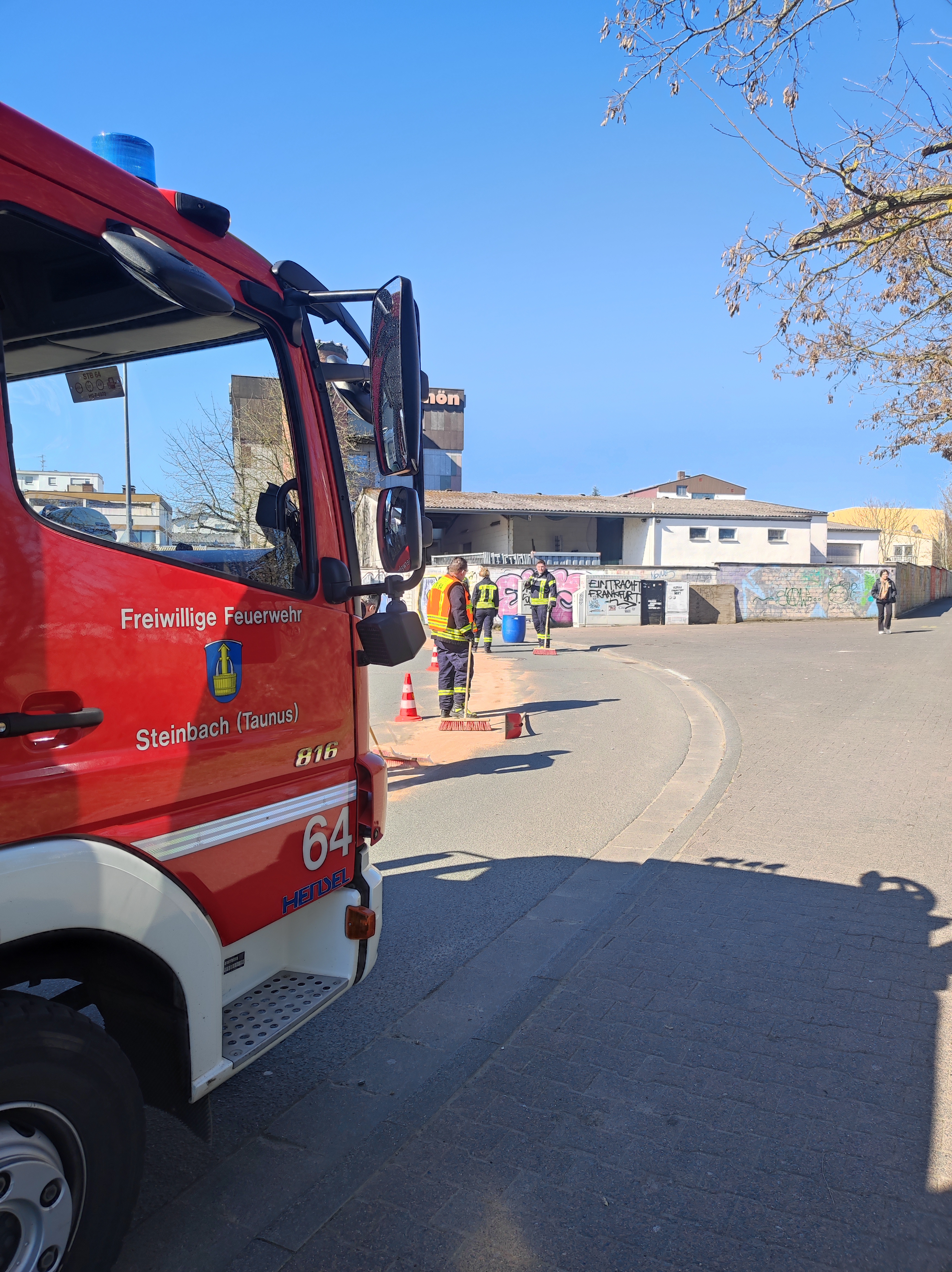 Während des vorangegangenen Einsatzes wurde der Feuerwehr eine größere Ölspur im Wingertsgrung gemeldet, welche sich bis ins Industriegebiet und von dort weiter nach Oberursel zog. Die Fahrbahn wurde an den betroffenen Stellen mit Ölbindemittel abgestreut. Im Anschluss wurde das Bindemittel wieder aufgenommen und die Fahrbahn gereinigt.