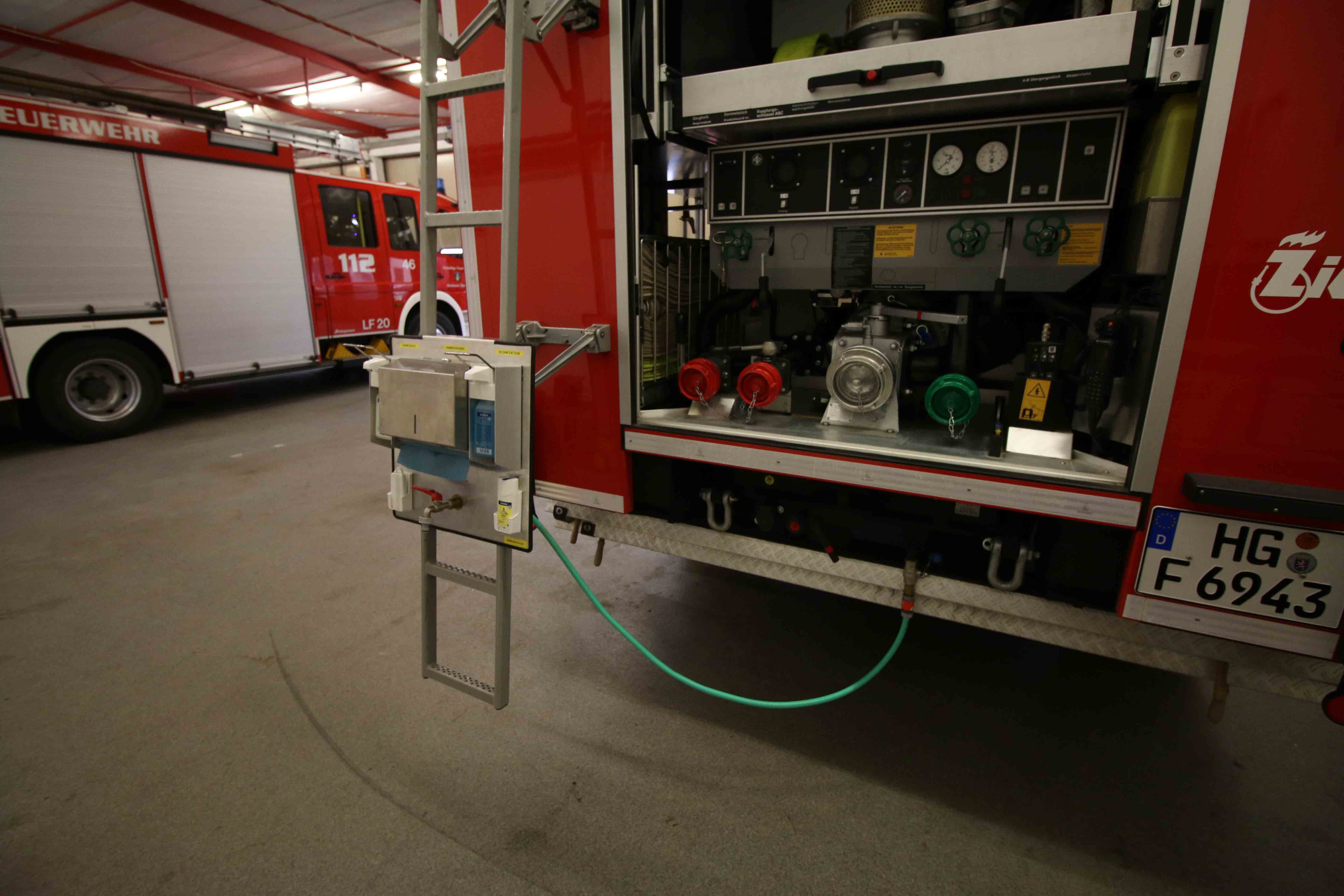 Das Hygieneboard dient der Einsatzstellenhygiene und wurde von Angehörigen der Feuerwehr Steinbach selbst entworfen und gebaut. Es besitzt zwei Spender, welche mit Desinfektionsmittel und Handseife bestückt sind. Des Weiteren gibt es eine Handwaschbürste und einen Handtuchspender für Einmaltücher. Auch gibt es eine kleine Spenderflasche mit Handcreme. Somit ist eine schnelle und ausreichende Reinigung von Haut- und Handflächen gewährleistet und die Kontaminationsverschleppung von der Einsatzstelle bis in die Feuerwache wird minimiert. Das Hygieneboard gibt es auf allen drei Löschfahrzeugen und wird an der Heckleiter des betreffenden Fahrzeuges eingehängt. Es wird durch den jeweiligen Löschwassertank mit Wasser versorgt, sodass das Hygieneboard schnell und unabhängig eingesetzt werden kann. Zusätzlich wird noch eine Bürste mit Wasseranschluss vorgehalten, um auch der Grobreinigung von Stiefeln und Einsatzkleidung nachzukommen.